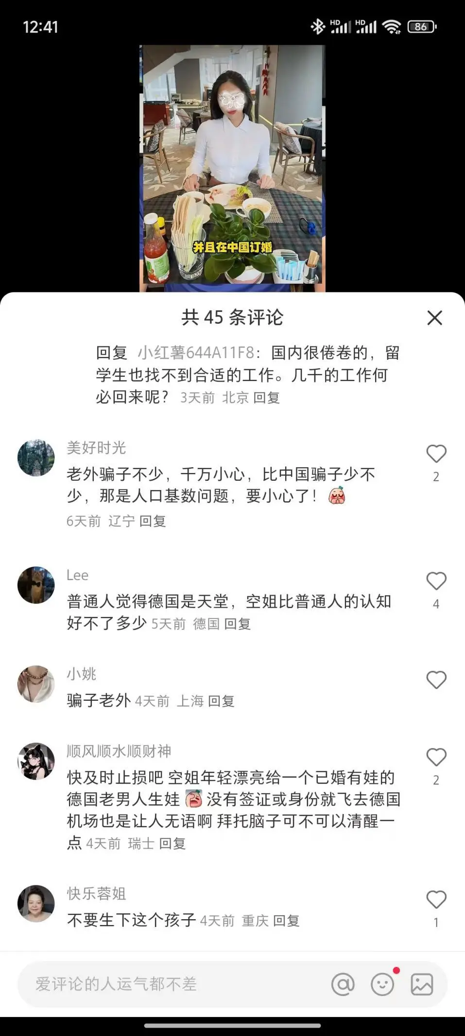 “快及時止損吧,你一個空姐,年輕漂亮,結果給一個已婚有娃的德國老男人生孩子。沒簽證或身份好歹你飛去德國機場啊,真是讓人無語,腦子能不能清醒一點?”(瑞士IP)