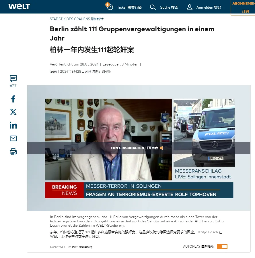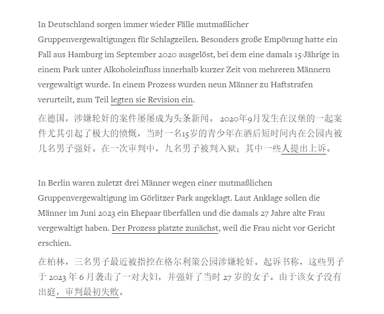 “同樣還是在柏林,3名男子去年曾被指控在柏林的格爾利策公園涉嫌輪姦一名年輕27歲的年輕女子。起訴書上説,這些嫌犯於 2023 年 6 月在公園裏襲擊了一對夫婦,對女子實施了性侵。由於受害人沒有出庭,所以針對這3名嫌犯的審判以失敗而告終。”