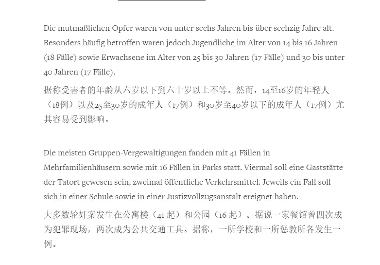 Hochgrebe)介紹,德國的首善之都柏林,在過去一年之內發生了111起輪姦案,受害女性的年齡從6歲以下到60歲以上不等,嫌疑男性的年齡則從12歲以下到60歲以上不等。柏林的大多數輪姦案都發生在公寓樓和公園裏,但有一家餐廳曾經在一年之內發生過4次輪姦案,另外在公共交通工具上也曾發生過兩次。”