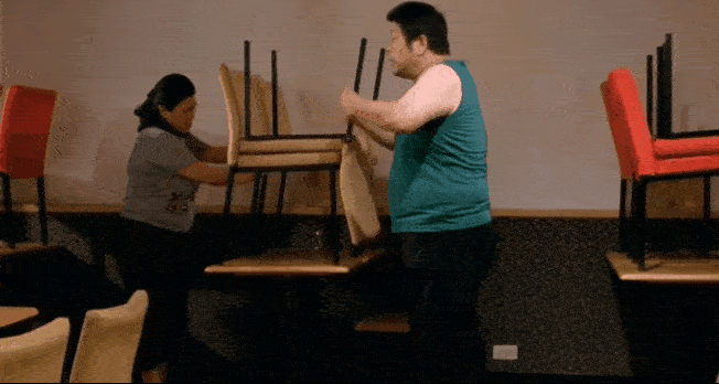 而是下意識給家中的燒臘店扶椅子、做家務,走進鏡頭的盲區。