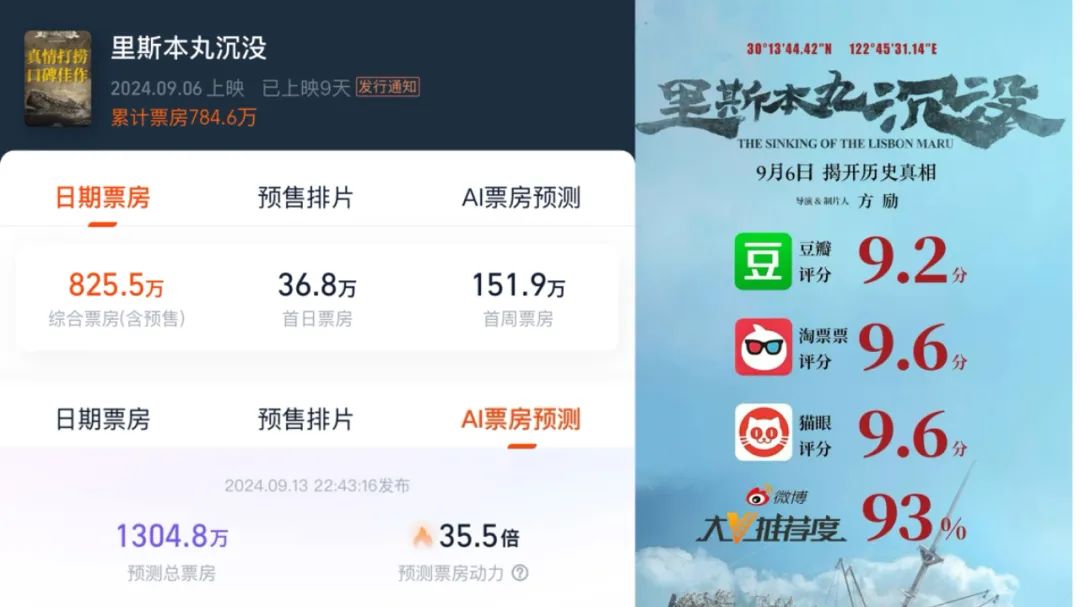 上映9天,截至毒眸發稿前《里斯本丸沉沒》已經取得825萬(含預售)票房,燈塔AI預測總票房上漲為1304.8萬,對於紀錄片來説,已經是一個頗為可觀的成績。豆瓣開分9.2,更是讓它一舉成為了今年目前為止評分最高的院線電影。越來越多人,正在看到這部心血之作。