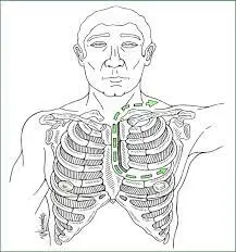 主任深吸一口氣,拿着柳葉刀劃出了一個U形的切口,從第二肋間到胸骨中線再折回來到鎖骨上。