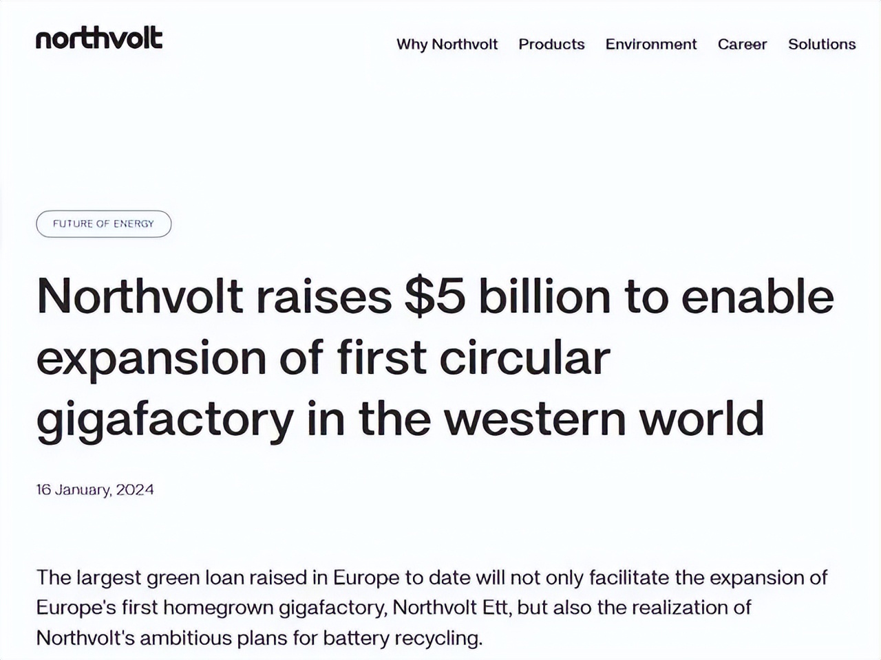 2024年1月,Northvolt宣佈獲得50億美元新融資
