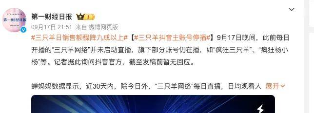 根據最新消息,昨日,三隻羊集團旗下直營及達人賬號,全部停止直播,但今日(9月18日)一大早,三隻羊官方授權賬號「瘋狂小楊弟」復播了。