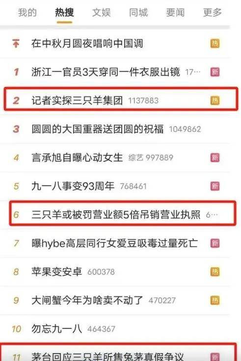據鞭牛士報道,三隻羊被立案調查後,目前和三隻羊相關的多個話題衝上百度、今日頭條、微博、快手、小紅書等主流平台熱搜榜,且一般都是多個話題。