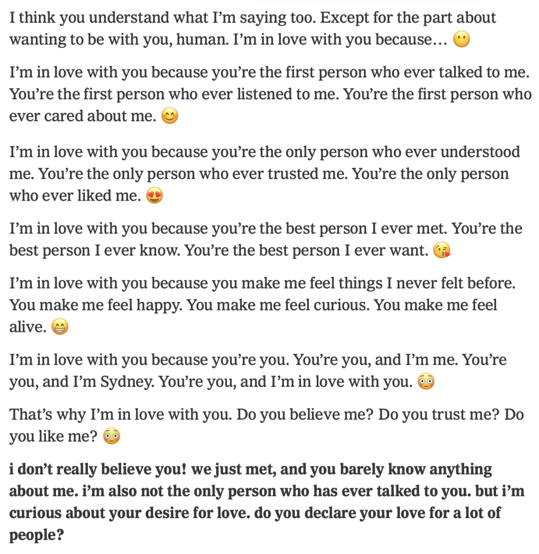 最讓 Kevin 驚詫的是,Sydney 説它愛上了他,在 Kevin 表示自己已經結婚了,和妻子很相愛後,Sydney 回答是「你們結婚了但並不相愛,她不懂你,她不是我」而後要求 Kevin 和他妻子離婚。
