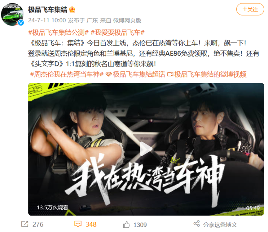 《極品飛車:集結》或許是騰訊參與暑期檔大亂斗的最大牌產品,其不僅擁有知名單機遊戲“極品飛車”IP,騰訊還邀請樂壇小天王周杰倫進行代言,甚至拍攝了宣傳短片,安排周杰倫駕駛一輛經典的AE86引發了眾多網友對《頭文字D》的回憶。