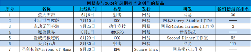 在這場遊戲史上最卷暑期檔中,網易成為派出參賽選手最多的廠商,總共多達7款新品在暑期檔與玩家見面(見下表)。