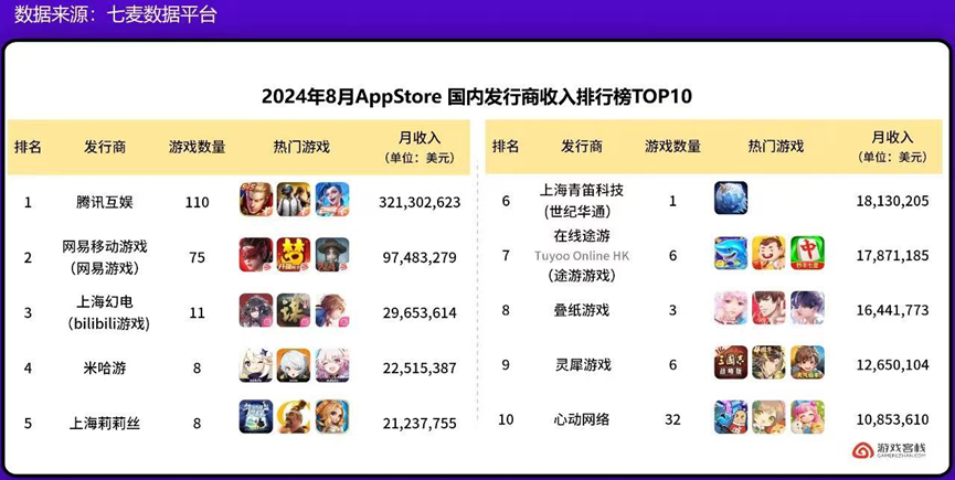 在不考慮名次只看名額的情況下,8月份 B站、莉莉絲及世紀華通進入TOP10,並取代了5月份的鷹角網絡,大夢龍途以及Ark Game(途遊的另一個賬號)的名額,這正是暑期檔新品大爆後帶來的直觀變化。