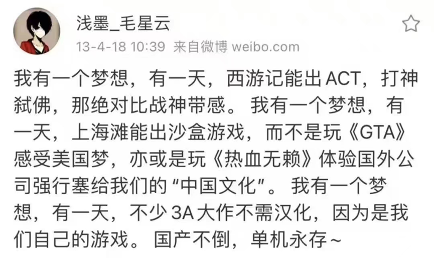 “我有一個夢想,將來的某一天,大家都能玩到藴含着中國上下五千年本土文化的優質遊戲大作。
