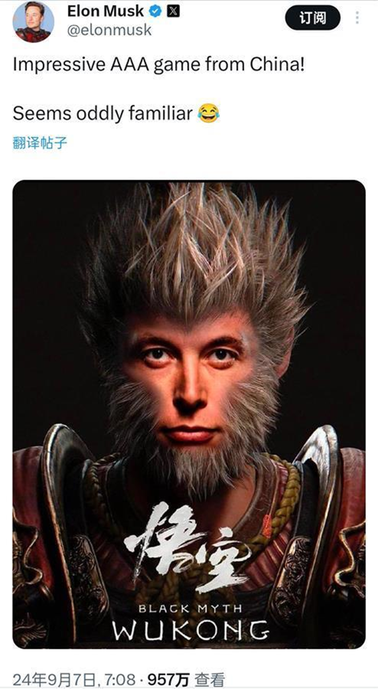 在國內,《黑神話:悟空》引來官媒到玩家的集體稱讚,在海外,它也同樣引發全球性轟動,比如美國知名企業家埃隆·馬斯克就在社交媒體平台“X”上發佈了一張“悟空版”AI照片,發文稱“來自中國的令人印象深刻的3A遊戲!似乎莫名熟悉”。