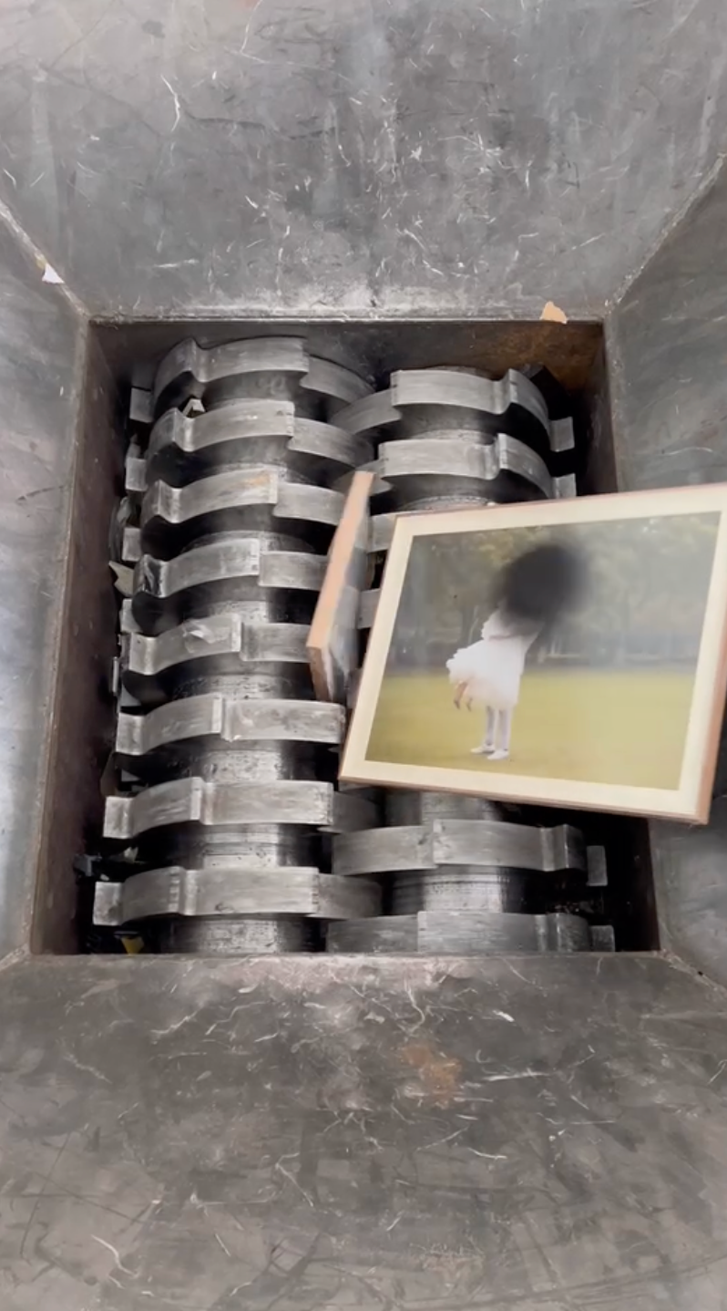 將婚紗照拆包、噴漆、丟進撕碎機裏進行粉碎,幾分鐘後,產出的碎片會被收集到一起,統一被清運車送去電廠,在1000度高温中溶解。塵歸塵,土歸土。