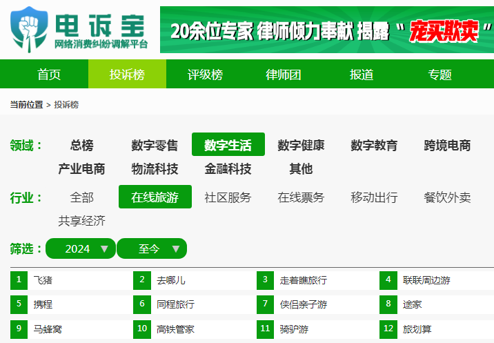據國內知名網絡消費糾紛調解平台“電訴寶”顯示,2024年至今在線旅遊平台按投訴量排名依次為:飛豬、去哪兒、走着瞧旅行、聯聯周邊遊、攜程、同程旅行、俠侶親子游、途家、馬蜂窩、高鐵管家、騎驢遊、旅划算。