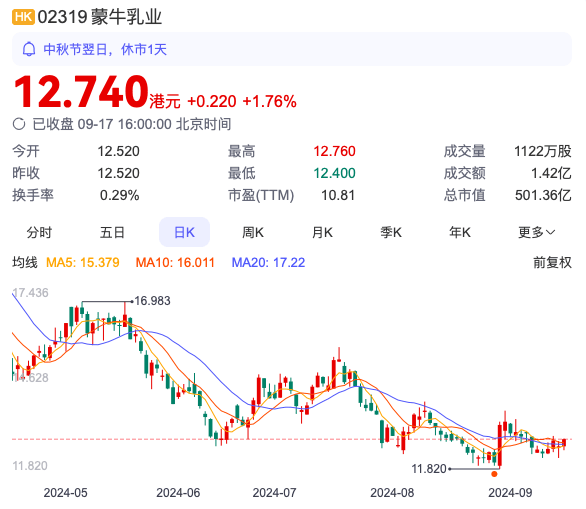 蒙牛乳業股價在2023年2月達到39.17港元/股的高點後,開始了較長時間的下跌,低點至11.82港元/股,較高點跌幅接近70%。截至9月10日收盤,公司股價為12.74港元/股,總市值501億港元,與往昔早已不可同日而語。