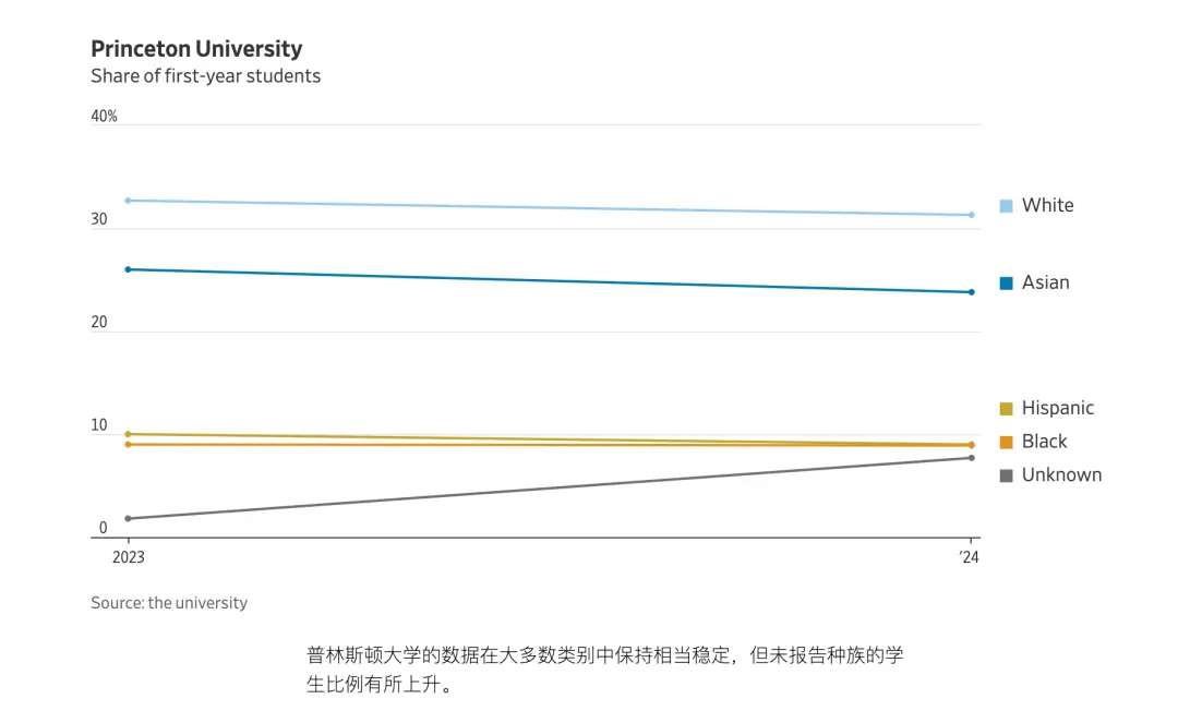 普林斯頓:黑人學生比例保持不變,在9%左右。西裔從10%降至9%。亞裔學生比例下降,從26%降至23.8%。