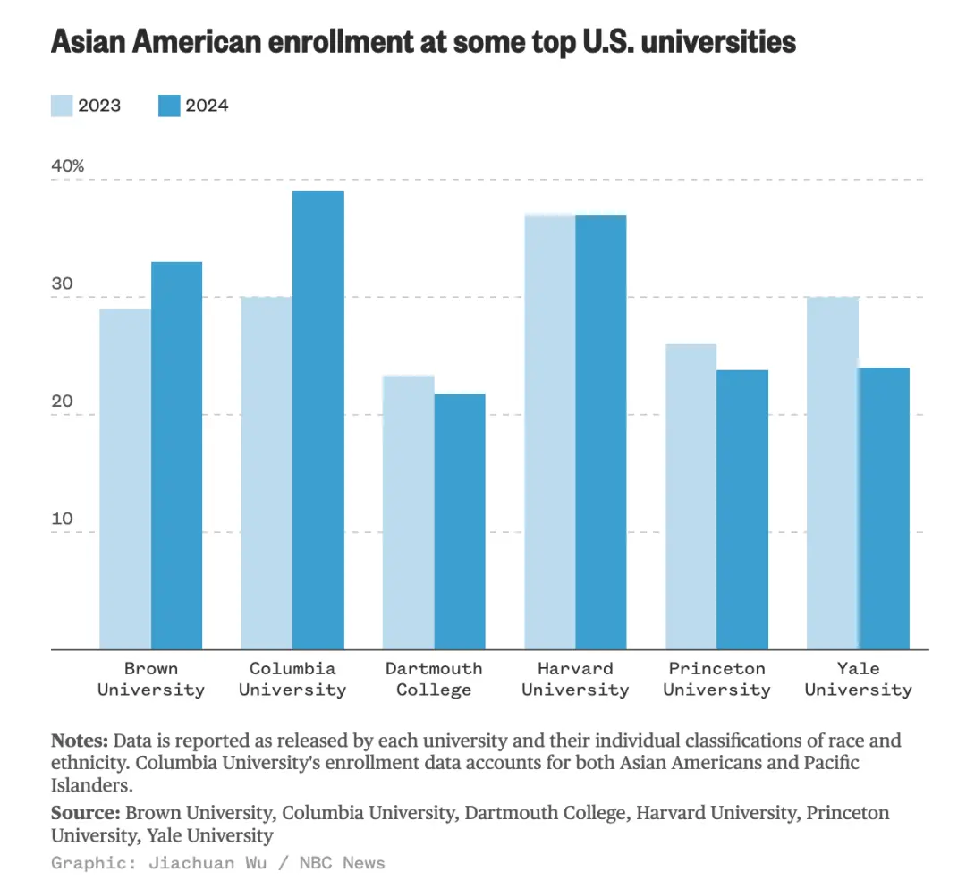 2024年為深藍,2023年為淺藍,布朗、哥倫比亞大學亞裔學生比例上升,達特茅斯、普林斯頓、耶魯下降,哈佛保持不變。來源:NBC新聞。