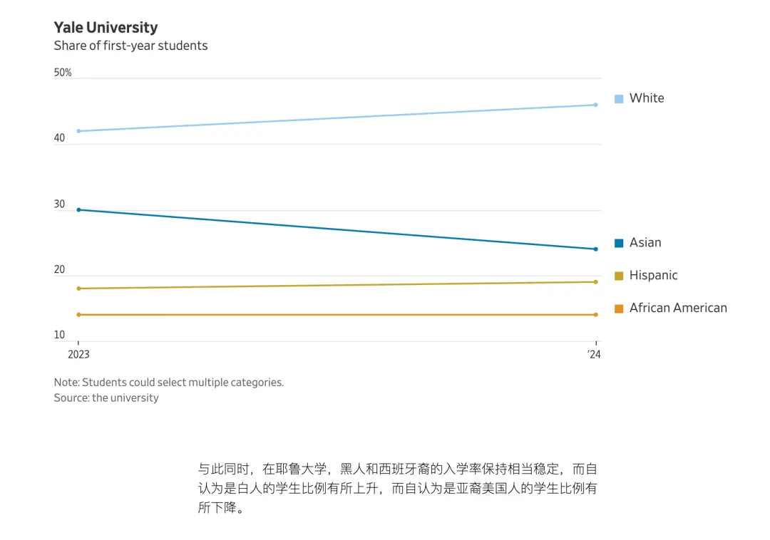 耶魯:黑人學生的比例保持不變,保持在14%左右。亞裔學生比例下降,從30%降至24%。這些數字表明白人學生比例增加了4%,亞裔學生比例減少了6%。