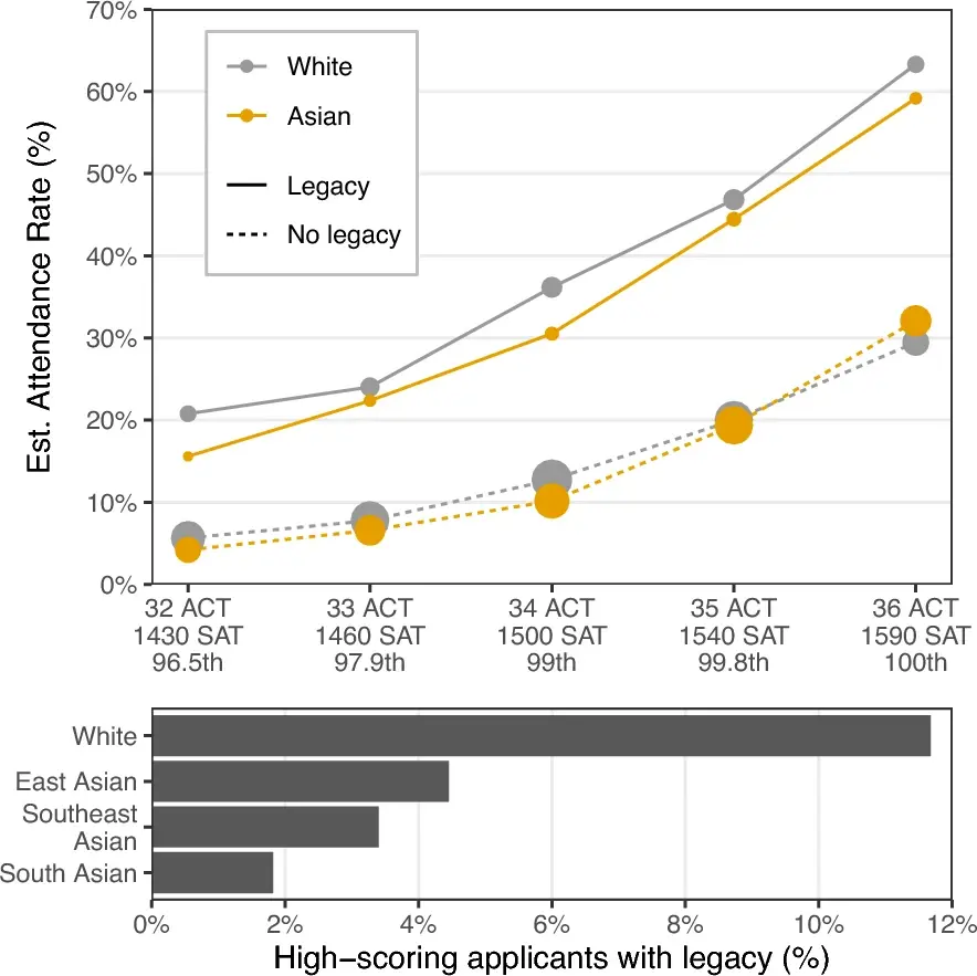 杜克大學的經濟學家彼得·阿西迪亞科諾(Peter Arcidiacono)在2019年的一篇論文中預測,如果取消校友子女錄取優惠政策,同時保留平權法案,並在六年內保持哈佛錄取的申請人數不變,那麼白人錄取人數將減少4%。