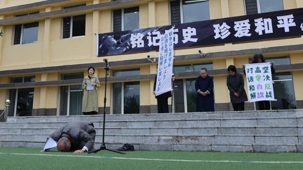 謝罪儀式現場,另有4名侵華日軍後代站在台上一同表達謝罪之情。他們手中舉着白旗,上面分別用中文、日文書寫着“堅決反戰、高舉白旗、對話和解”。