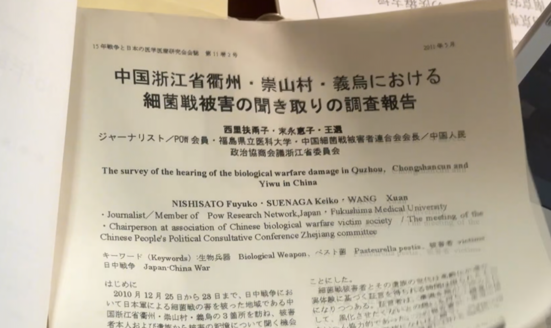 福島縣立醫科大學醫學部講師 末永惠子:對浙江省實施細菌戰攻擊,主要是由“榮字1644部隊”來實施的。不僅公然使用飛機散播病菌來實施細菌戰,也為間諜暗殺活動開發相關道具。這是已經被證明的事實。