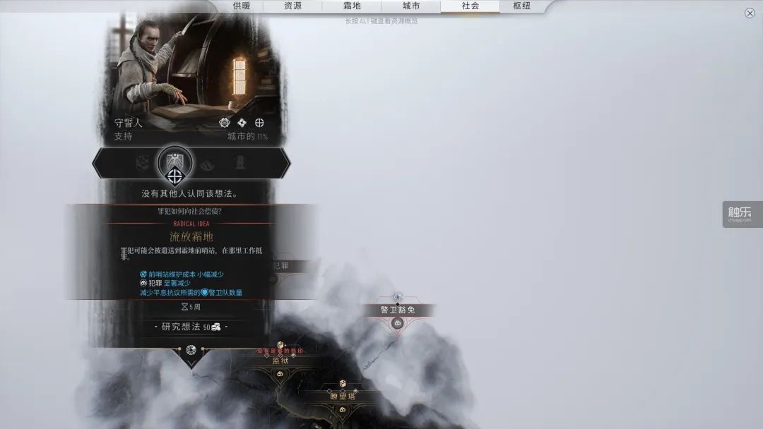 在劇情抉擇上,陣營會顯現出更多影響。比如是無差別接受外來者,還是隻接受勞動力;是否允許外來勞動力攜帶家屬,等等。這些更偏向意識形態的選擇會反饋在屏幕左下角的量表中,它反應的是當前主城的社會形態傾向——也可以理解為玩家本人(至少是在本局中)的思想光譜。