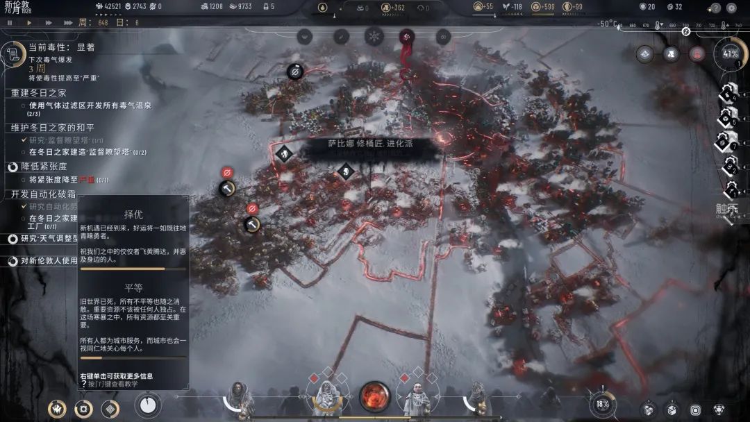 換句話説,《冰汽時代2》的重心從生存轉向了另一個問題——玩家想要為人類最後一座城市的未來選擇怎樣的文明形態。既然是選擇道路,就一定存在分歧,而且時時刻刻都有分歧,玩家作為執政官的地位和受到的尊敬也並不穩固。這對一部分前作中認為自己在扮演帶領民眾的偉大領袖,在末世還拒絕加班、要求娛樂的人是“刁民”的玩家來説,在玩法和自身定位上,面臨着比之前更大的轉向。