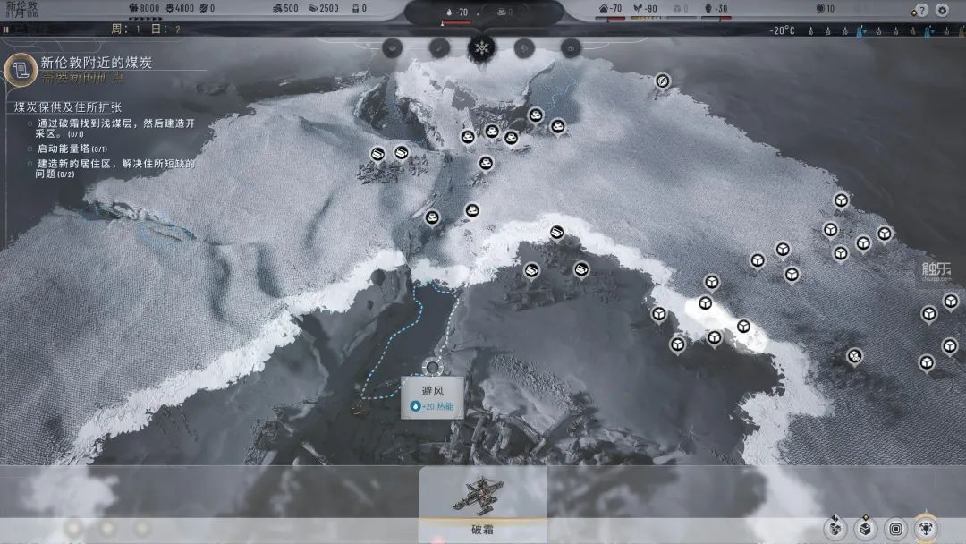 玩家在進行任何建築工作之前需要先在厚厚的冰層上進行破霜。破霜後能夠以區域為單位進行規劃建造,比如居住區、開採區、工業區、後勤區等等。而不管是破霜還是建築區域,都需要佔滿一定數量的蜂窩格子,通常為6到8個。