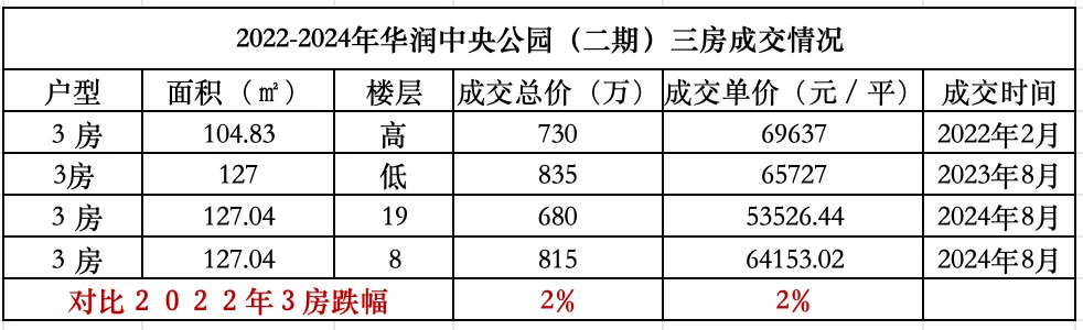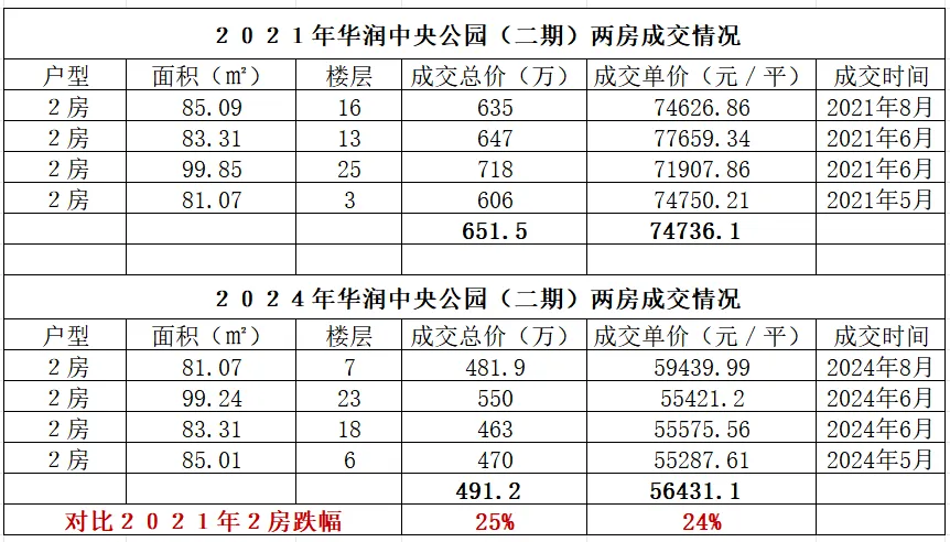 根據鏈家樣本數據顯示,對比2021年,華潤中央公園二期的2房產品跌幅在**25%**左右