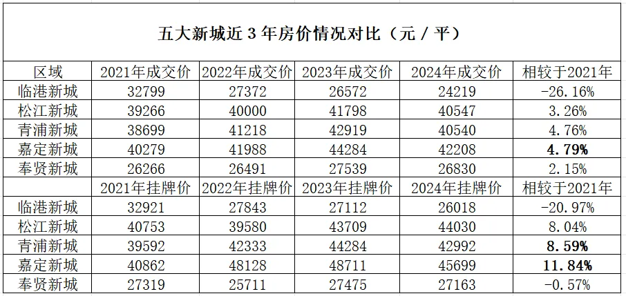 相較於21年,嘉定新城成交均價上漲了4.79%,掛牌均價上漲了11.84%,但是也可以看到即便是嘉定新城,24年較23年價格還是下滑了的