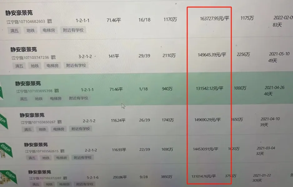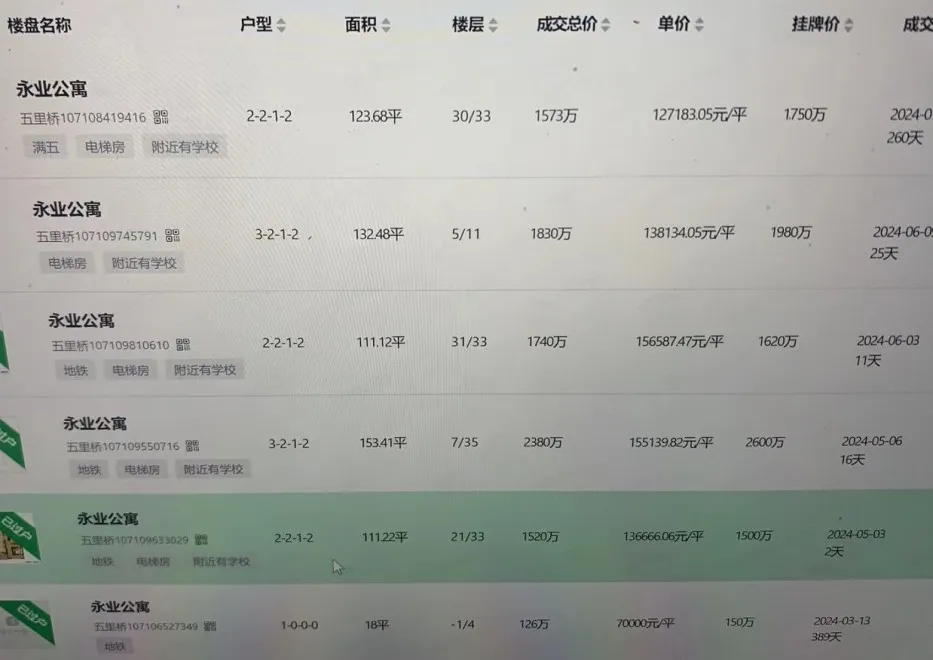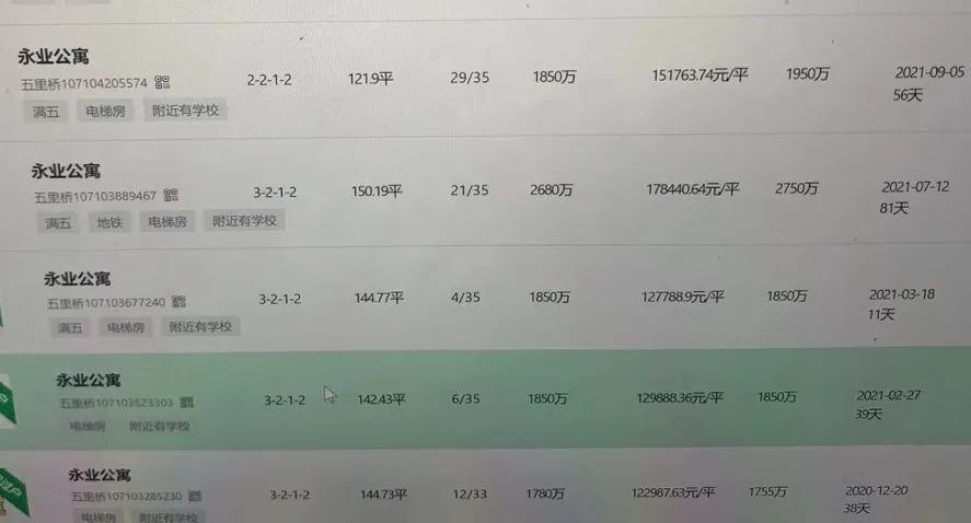 還有一個案例是位於五里橋的永業公寓,2021年成交均價從約12萬/㎡到17萬/㎡不等