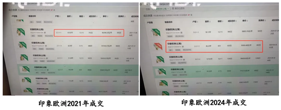 把印象歐洲在鏈家的2021、2024年的成交記錄拉出來對比後