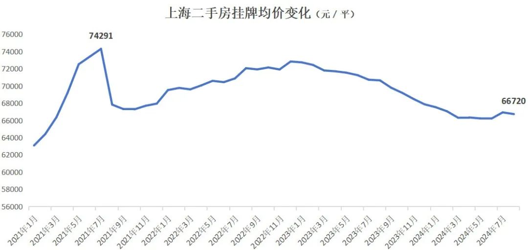 比如,2021年8月上海二手掛牌均價為74291元/㎡,截至2024年8月上海二手的掛牌均價為66720元/㎡,整體跌幅約為10%