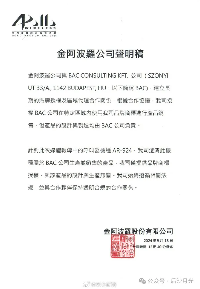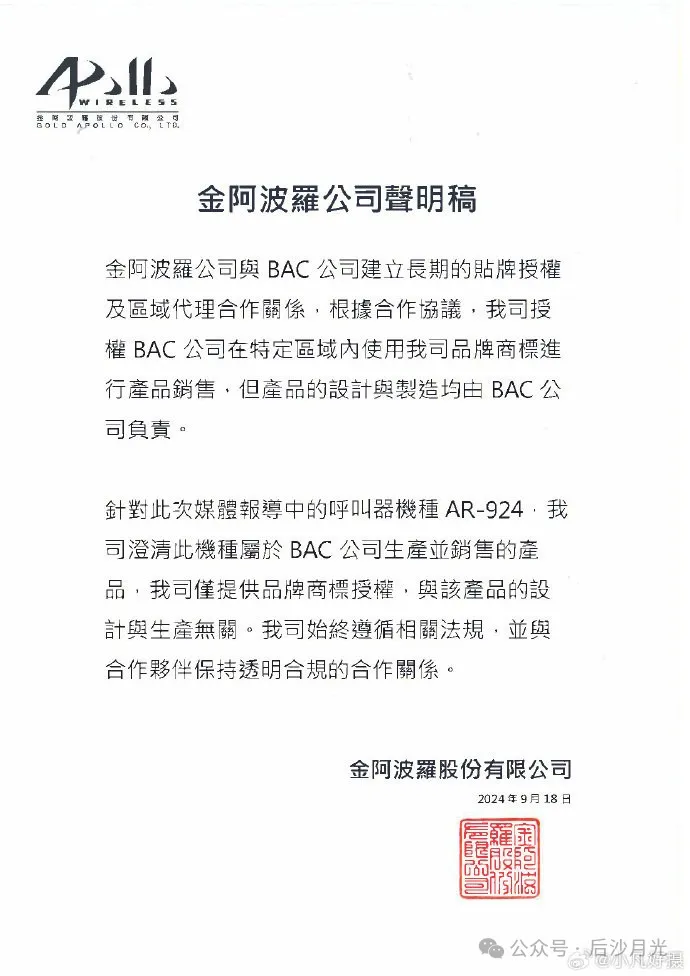 金阿波羅公司已發佈了兩份聲明(圖中是第一份),主要是説殺人BB機與本公司無關。