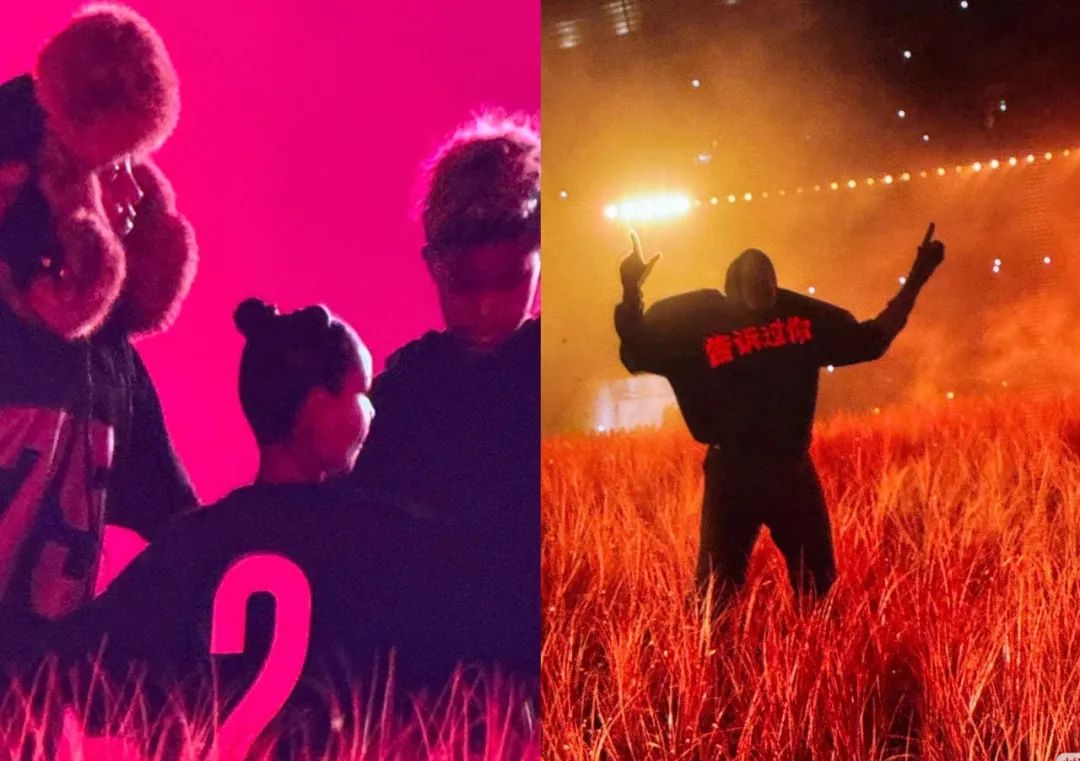 開場後,**侃爺穿着黑色衞衣上面有紅色中文“告訴過你”,緩緩步入金色麥田的舞台中央。**鋼琴前奏響起,蘇蘇和身邊的粉絲們按捺不住地尖叫,這是他們最熟悉和喜愛的歌曲《Runaway》。蘇蘇用“超出預期的完美”形容這場演出的體驗,他沒想到YE大聲説出中文開場“I LOVE U 海口”;沒想到觀眾的大合唱如此震撼;沒想到侃爺的四個孩子也來到舞台中央……
