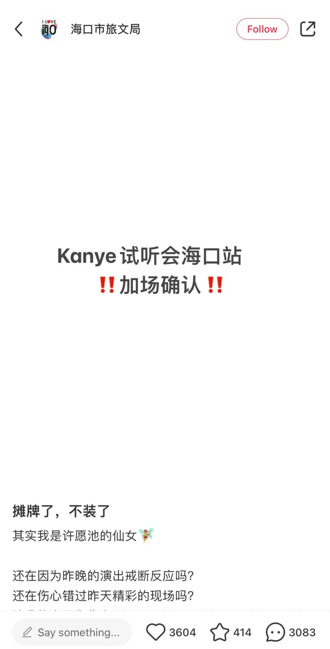 據9月16日海口文旅宣佈,確定Kanye West“試聽會”9月21日加演一場。側面印證了侃爺對演出效果的正反饋,也體現出中方保障團隊的專業性,對此前未搶到票的觀眾更是一次彌補遺憾的機會。此次侃爺的“椰城”(海口暱稱)之行,充滿了多方共贏的和諧因素。這次演出的成功或許也為更多二三線城市文旅業帶來啓發。