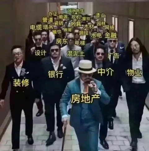 而且房地產下行,本身就會對很多相關產業的從業者帶來巨大影響,他們的收入受挫,預期悲觀,又會進一步帶崩樓市,這相當於一個惡性循環。這兩天房地產作為大哥,帶着一幫小弟往前走的圖,在我的好幾個羣裏傳。