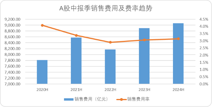 圖:A股中報季銷售費用及費率趨勢,來源:Choice金融客户端,錦緞整理