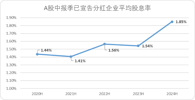 中報季整體現金儲備下降的另一個因素是,國九條發佈後,今年上半年A股宣告分紅企業的股息率均值達到了1.85%,同比提升了0.3pct,遠高於往年同期。