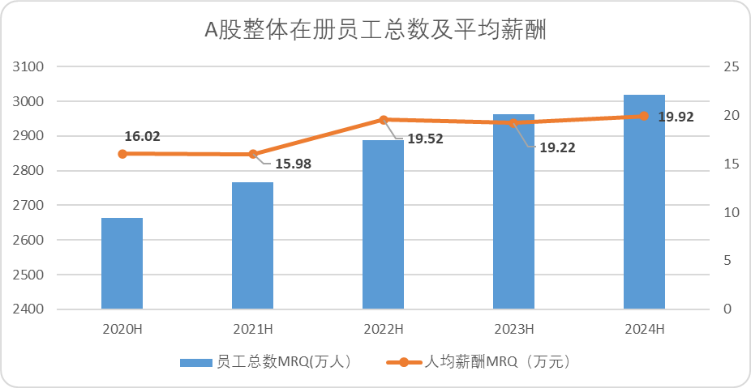 圖:A股整體在冊員工及平均薪酬趨勢,來源:Choice金融客户端,錦緞整理