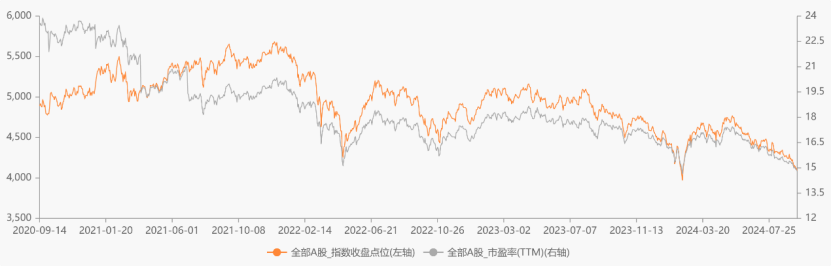 A股整體估值上半年處於波動震盪期,以PE-ttm口徑來看圍繞着20-24x區間窄幅震盪,但5月之後A股無論是點位還是估值區間進入了相對漫長的單邊下行,目前A股最新的估值約為14.8-15x之間,處於相對低估的區間。