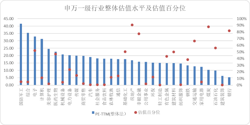 圖:申萬一級行業整體估值及百分位,來源:Choice金融客户端,錦緞整理