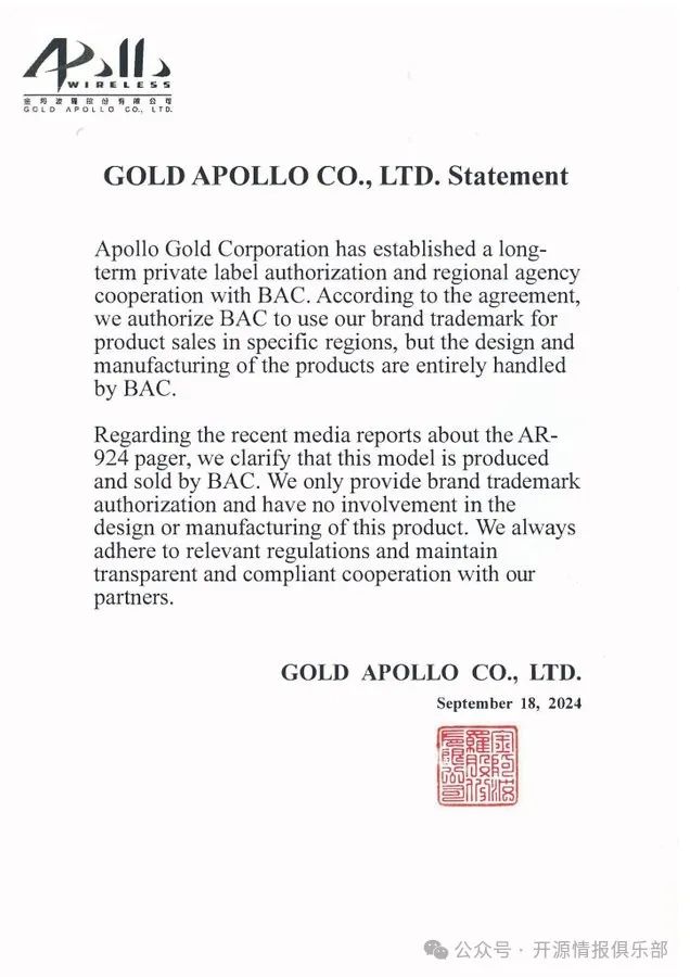 隨着人們發現爆炸的傳呼機是由一家台灣金阿波羅(Gold Apollo)公司製造的,Gold Apollo首席執行官Hsu Ching-Kuang(音譯:許景光)就此事趕緊舉行了新聞發佈會,聲稱真主黨訂購的AR-294尋呼機是由一家名為BAC的公司授權生產的。