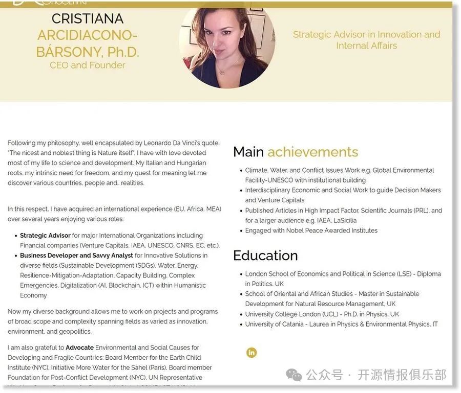 該公司所有者為克里斯蒂安娜·阿爾西迪亞科諾·巴索尼(Cristiana Arcidiacono Barsony) ,在英國最負盛名的大學之一(倫敦大學學院)獲得物理學博士學位,隨後在倫敦經濟大學學習,還在英國首都完成了研究生培訓,她的簡歷聲稱她是一名“科學家,利用我非常多元化的背景從事戰略決策的跨學科項目”。