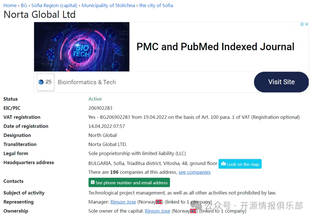 這家保加利亞公司由一名挪威個人所有,與匈牙利BAC諮詢公司一樣,保加利亞公司也是在總部服務提供商處註冊的,註冊地址位於保加利亞索菲亞Triaditsa區Vitosha48號,該註冊地址總共註冊了196家公司,這家保加利亞公司成立於2022年4月,表面上看,它從事項目管理,但據推測它不製造任何東西。