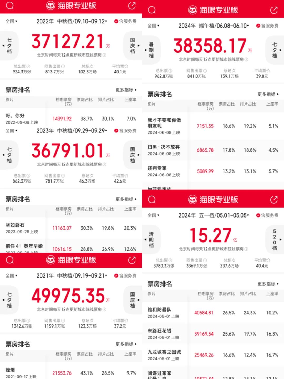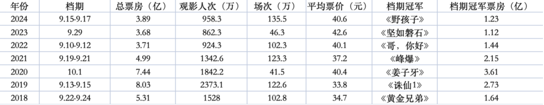 中秋檔三天的單日票房體量分別為1.25億、1.37億與1.26億,幾乎約等於今年上半年或去年年末時普通週末單日票房的成績。原本在大檔期前面開路的中秋檔,沒能趟出太多的水花。