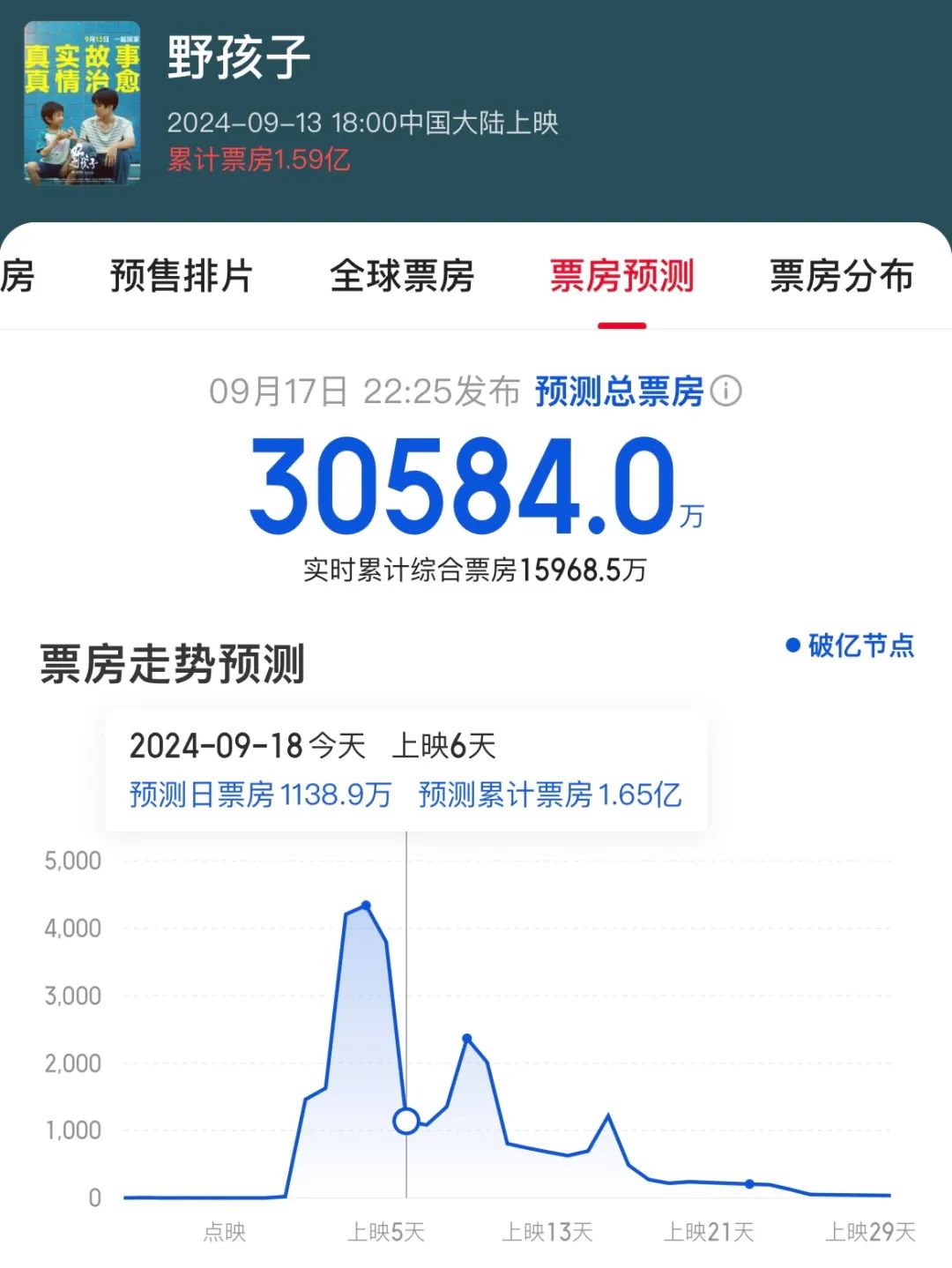 貓眼與淘票票兩大平台上,《野孩子》想看人數累計接近100萬人。在正式上映前一天,該片預售票房突破4000萬,遙遙領先第二名《出走的決心》。預售及前期票房很大程度上仰仗粉絲羣體的購買力。而前不久的《刺蝟》,同樣是王俊凱參與主演,最終預售票房為2700萬,對比下來,擇中秋檔上映的《野孩子》開局尚可。