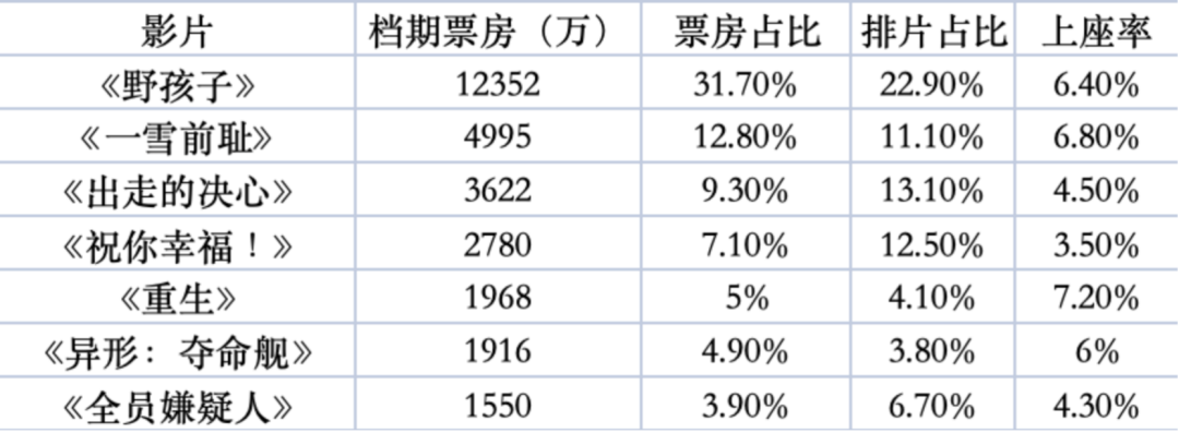 中秋檔的失利,也與缺少頭部爆款影片、中小體量影片扎堆相關。儘管中秋三天擠下了將近二十部新片,但僅有《野孩子》斷層式領先,以1.23億的票房佔據總檔期31.7%的份額。而接下來《一雪前恥》《出走的決心》等第二梯隊影片,票房均未突破五千萬關口。而且,檔期票房總榜上,還有暑期檔的《異形:奪命艦》與《重生》等老片憑藉長尾效應持續發力,二者共拉動近三千萬的票房。
