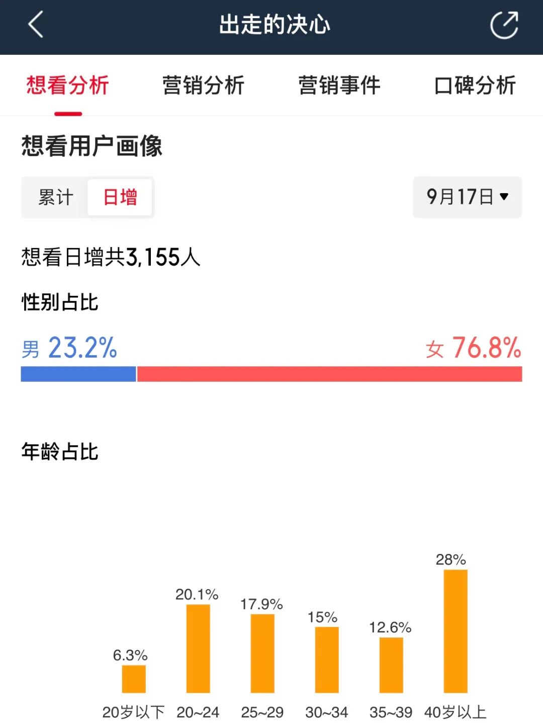 而餘下兩部影片,則存在一定的受眾壁壘。《出走的決心》與《祝你幸福!》都主打“女性必看”與“女性故事”,但明顯前者在這一道路上貫徹得更徹底。不僅是近年來少有的女導演操刀,而且在海報、短視頻等宣發物料上也更強調本片的“女性”標籤。《出走的決心》的抖音話題播放量為9.1億,是《野孩子》19.2億的一半,傳播效果並不顯著。但從用户畫像看,40歲以上的羣體為28.8%,佔據絕對優勢,中老年受眾罕見地抬頭。這也證明了這個講述“50歲阿姨自駕遊”的故事,確實找到了自身的受眾。