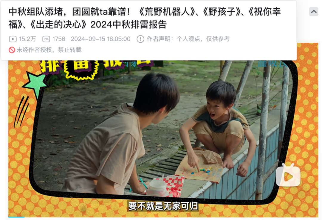 這三部影片中:《野孩子》改編自真實事件,聚焦於“事實孤兒”;《出走的決心》講述中年女性家庭之痛的,而《祝你幸福!》則以“離婚冷靜期”為題材。三者都是關於“家庭破碎”主題的情節劇,或多或少都帶着一點社會批判色彩,同時也不乏催淚苦情的部分,實際上,與閤家團圓的節日氛圍相背離。加之,中秋節又是一個短期旅遊與返鄉探親的高峯,現實題材的情節本身就不具備太大優勢。