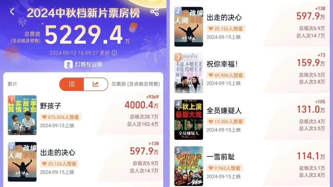 説到底,今年中秋檔這顆石子太小,激起的水花有限。行業還是不得不先做足準備,懷着忐忑的心走向國慶檔的激戰。